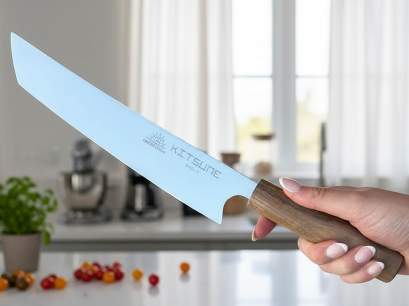 Kitsune Custom lama 23 cm acciaio chirurgico manico in noce pezzo unico con incisione della famosa volpe a nove code, adatto a tutti i tipi di taglio