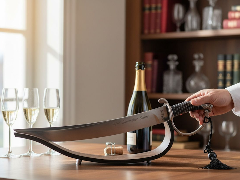 Sciabola da Sabrage con espositore in noce e nappa in tessuto