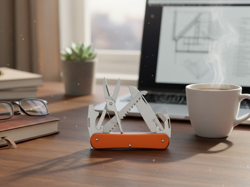Vulpis Fox manico in alluminio anodizzato ed accessori fino ai cinque usi: seghetto, apribottiglie, apriscatole, cacciavite a testa piatta e forbici.