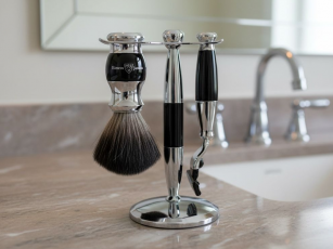 Pennello da barba Edwin Jagger in finto avorio (sintetico nero) Prodotto a Sheffield Altezza totale: 105 mm Diametro del nodo: 21 mm (medio) top – 55 mm Altezza della maniglia: 50 mm Peso – 50 g Adatto ai vegani