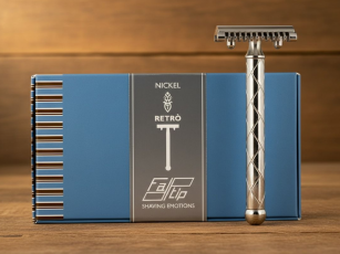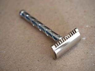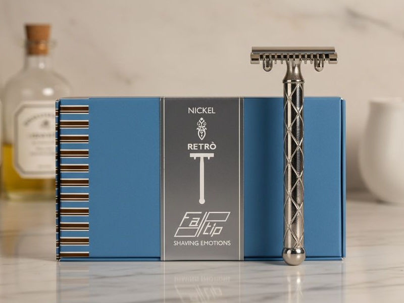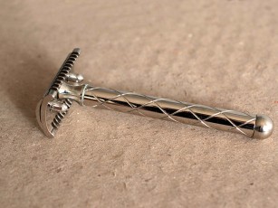 FATIP Rasoio in sicurezza Nickel Retrò lungo 110 mm con manico in ottone, poi sottoposti a rifinitura metallica. Il classico disegno del manico a losanghe interrotto dalla base sferica perfette di avere grip e manegevolezza del rasoio.